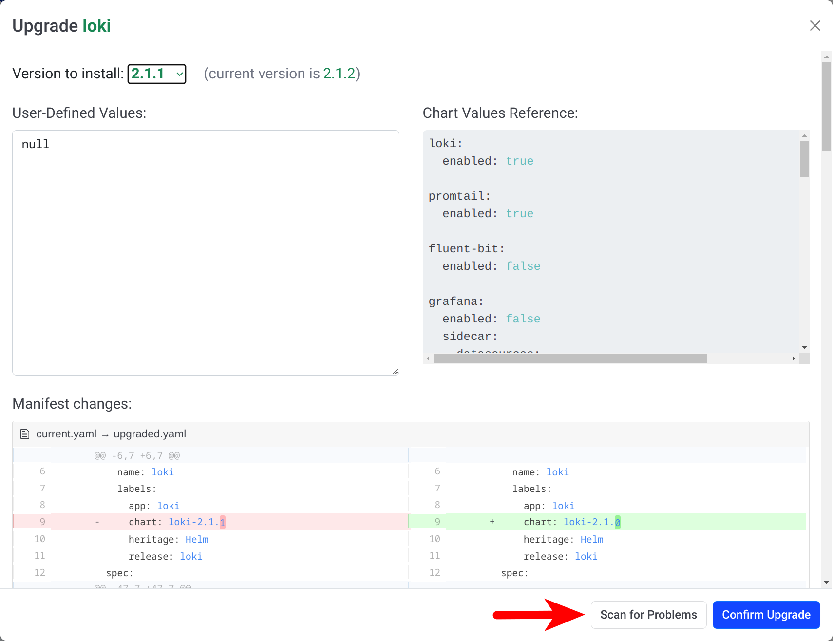 If you want to validate the k8s manifest prior to installing/reconfiguring a Helm chart, look for "Scan for Problems" button at the bottom of the dialog: